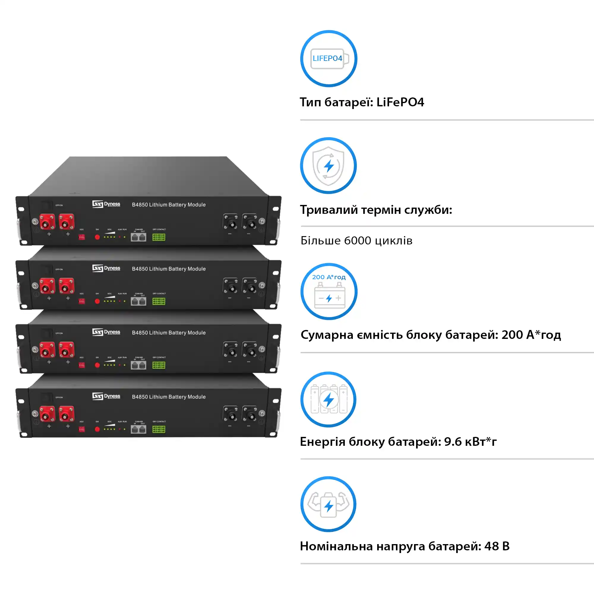 Система включает четыре батареи B4850 типа LiFePO4, обеспечивающие суммарную емкость 200 Ач и долговечность с жизненным циклом до 6000 циклов. Эти батареи позволяют системе работать бесперебойно и эффективно даже при высоких нагрузках.