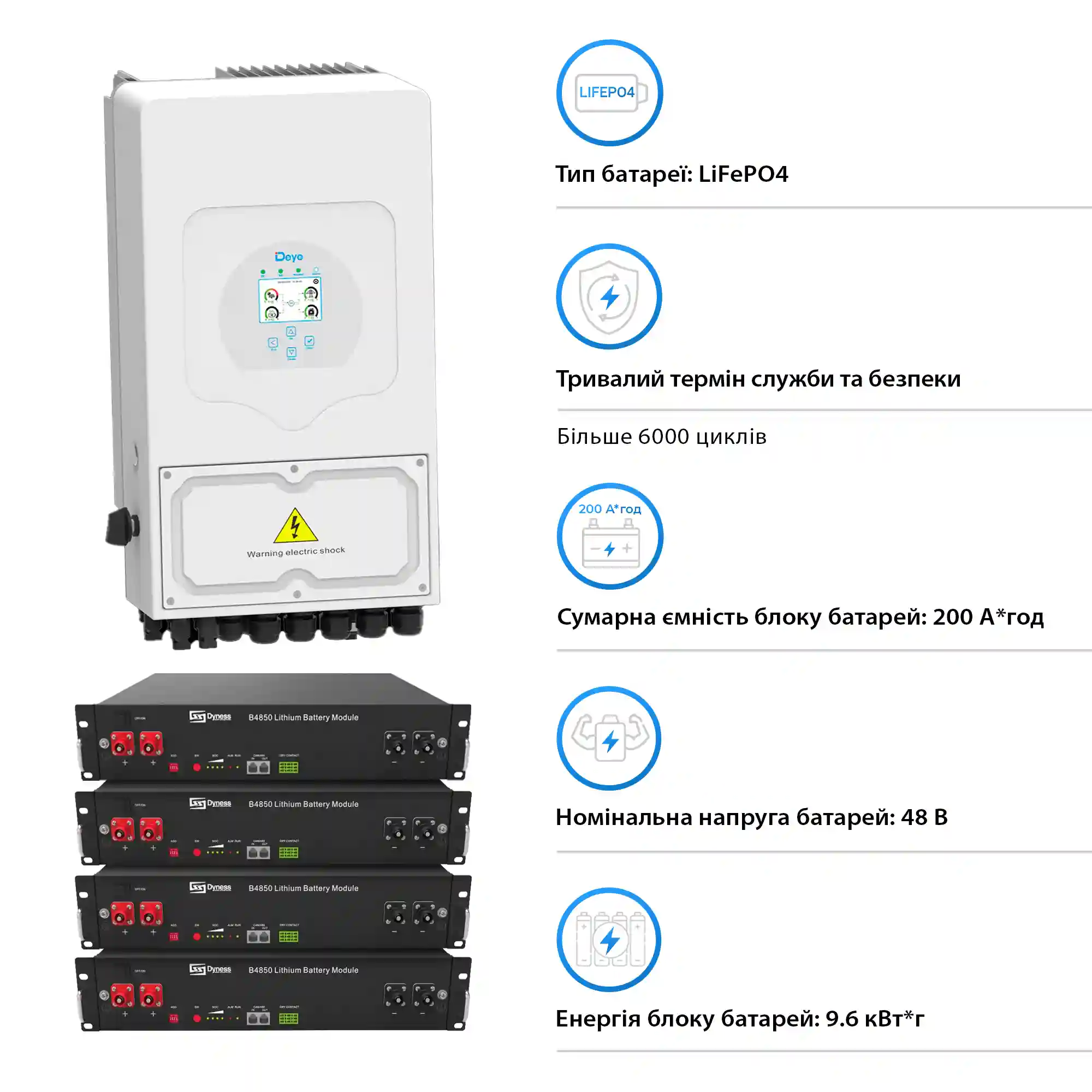 Система хранения энергии Solarverse 5kW-DEYE 9.6kWh-Dyness 4BAT LiFePO4 6000 циклов (SVR24-1DE5K1-LDY9.6K1-0) : Надежность и инновации в одном комплекте