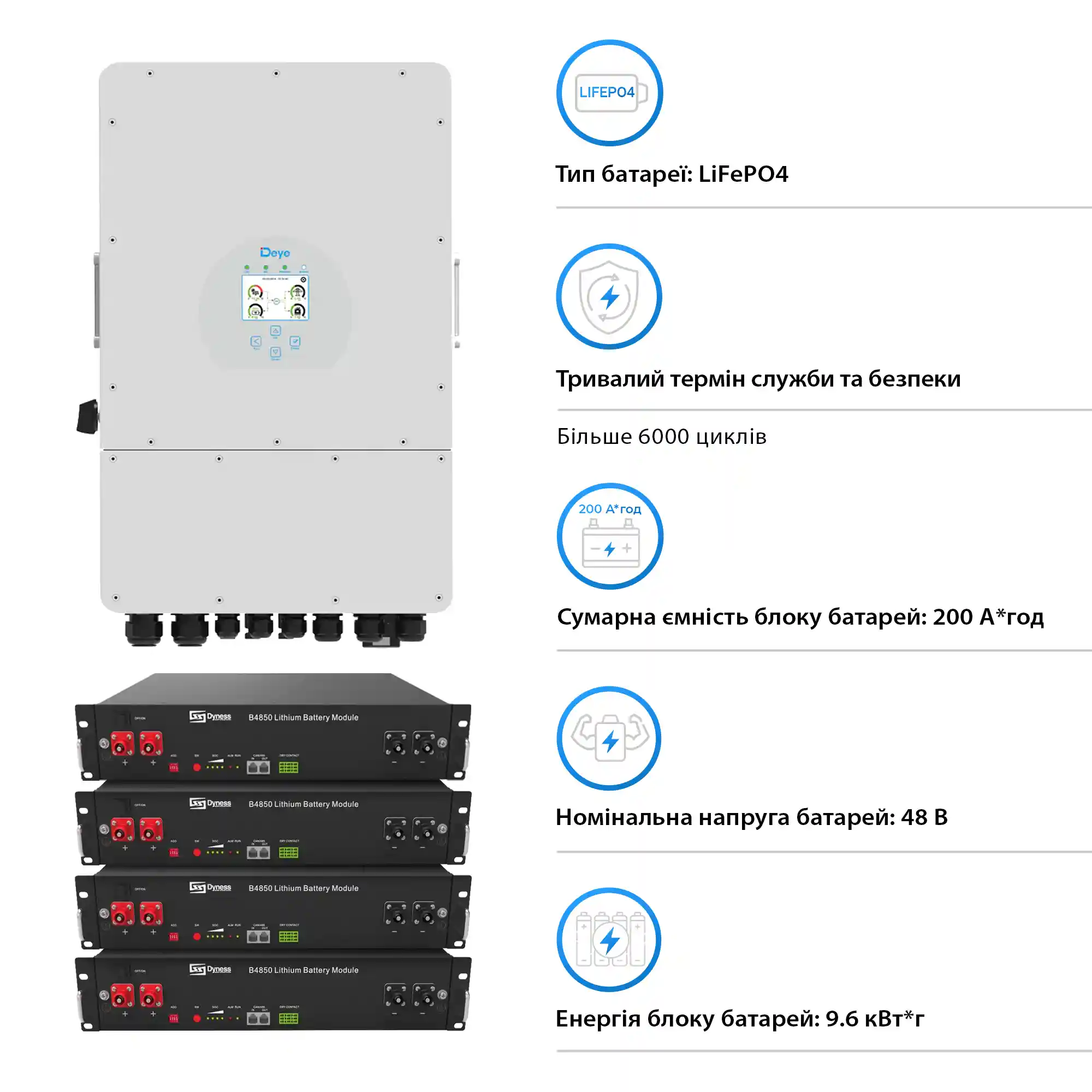 Система хранения энергии Solarverse 8kW-DEYE 9.6kWh-Dyness 4BAT LiFePO4 6000 циклов (SVR24-1DE8K1-LDY9.6K1-0)