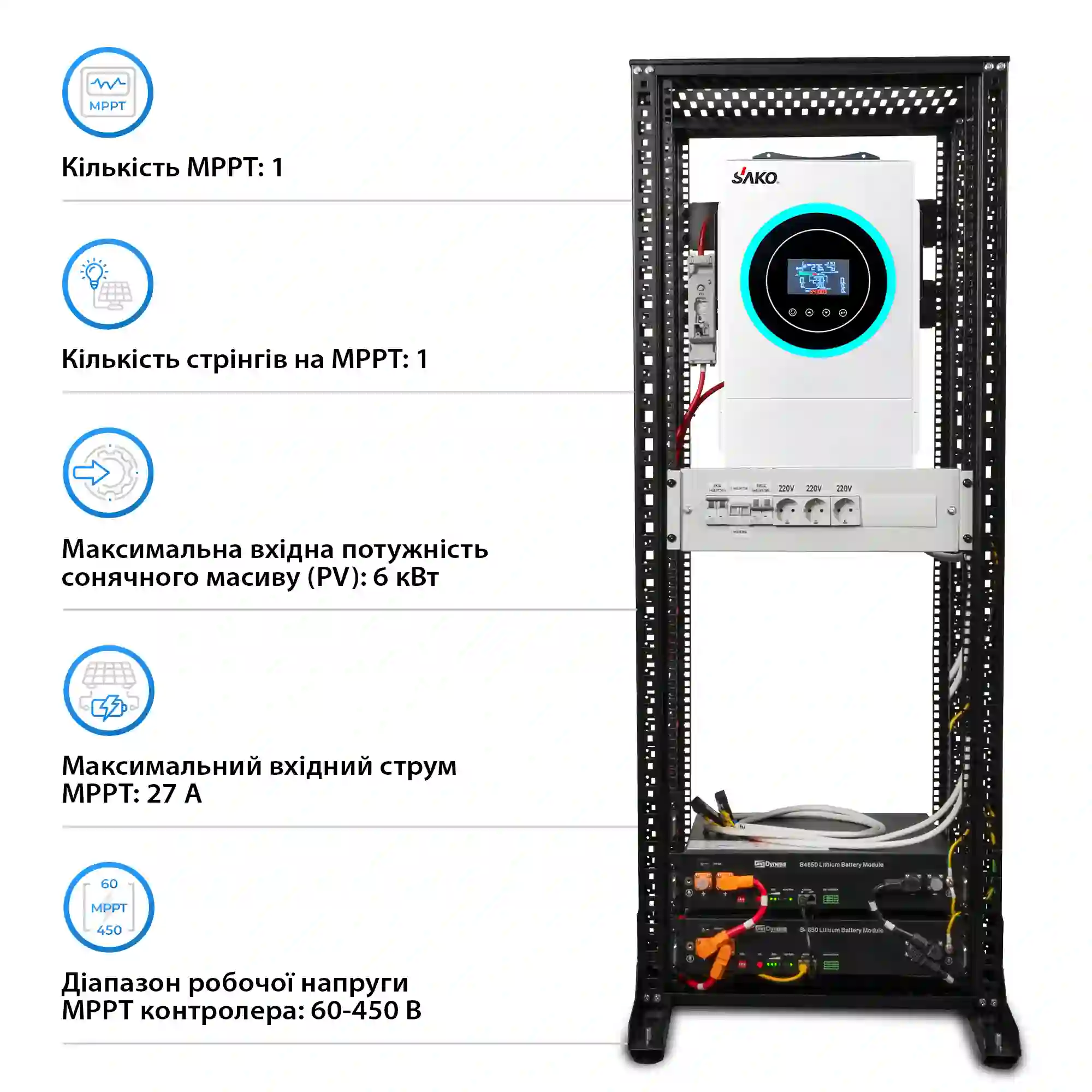 Сердцем системы являются две батареи B4850 типа LiFePO4. Их суммарная ёмкость составляет 100 Ач, что позволяет хранить 4.8 кВт⋅ч энергии. Это высокоэффективное решение, которое поддерживает до 6000 циклов зарядки-разрядки, обеспечивая вам долгие годы надёжной работы. Батареи заряжаются всего за 1 час благодаря встроенной MPPT зарядке на 80 А.