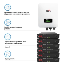 Система включает в себя один инверторный блок модели AF6K-SLP и шесть батарей B4850 типа LiFePO4, что обеспечивает надежную и долговечную работу. Инвертор гибридного типа с номинальной мощностью 6000 W и двумя MPPT обеспечивает оптимизацию работы солнечных панелей и максимальную входную мощность до 9 kW.