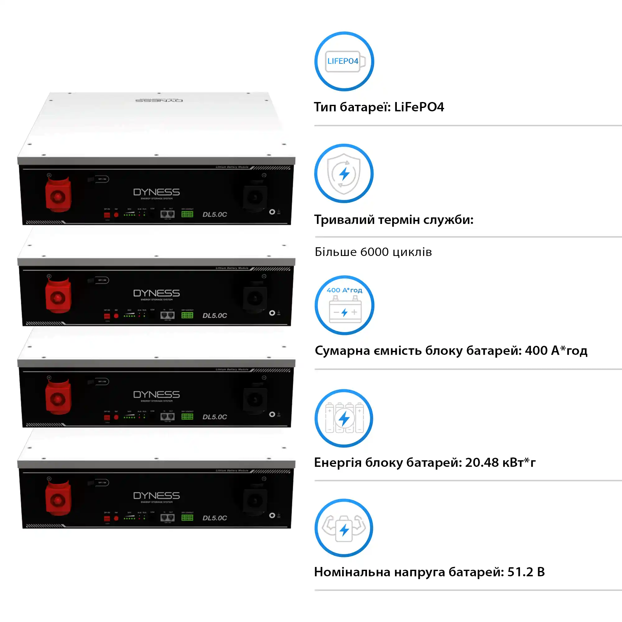 Комплект включает четыре высококачественные батареи DL5.0C на базе LiFePO4. Они гарантируют высокую безопасность и устойчивость к износу. Суммарная емкость батарей – 400 Ач при энергии хранения 20,48 кВтч. Батареи рассчитаны на 6000 циклов, что означает долгий срок эксплуатации при минимальной потере емкости. Полная зарядка занимает всего 2,4 часа при максимальном токе заряда 190 А. ⚡