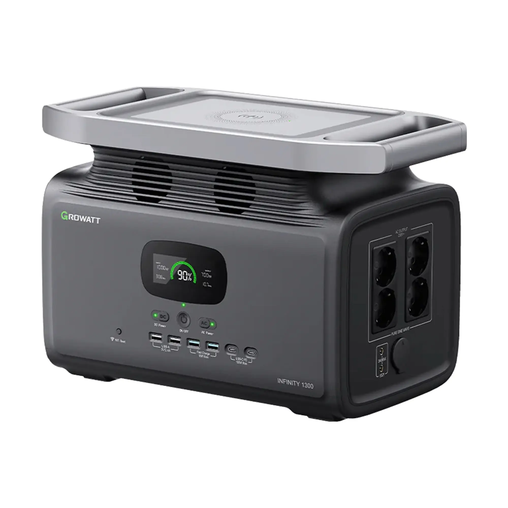 Growatt Infinity 1300 оснащена множеством разъемов для зарядки различных устройств. На борту находятся 4 розетки переменного тока (230В, 50/60Гц), автомобильный разъем (13.2В/10А), два порта DC5521, два порта USB-A, два порта USB-A с быстрой зарядкой, два порта USB-C (мощностью до 100Вт), а также беспроводная зарядка (15Вт). Вы можете одновременно подключать до 14 устройств, что делает эту станцию настоящим центром управления энергией! 🔌
