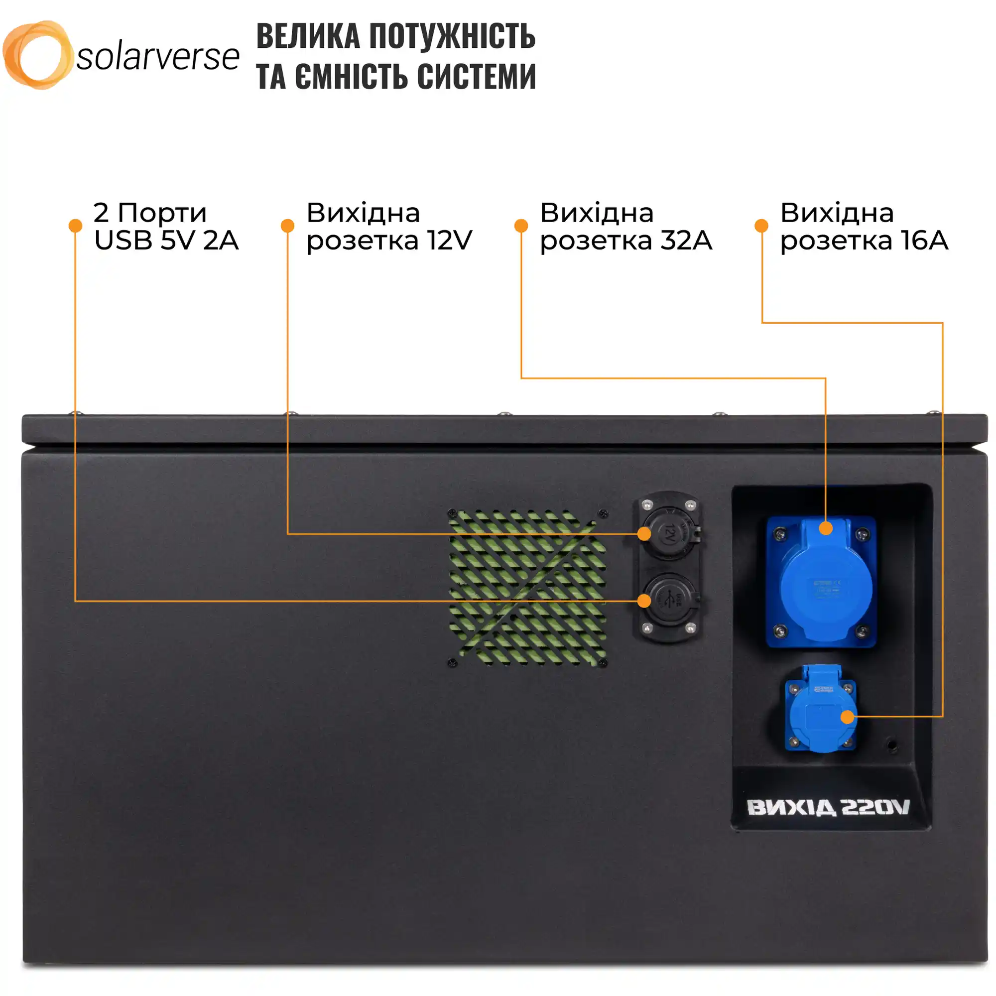 - USB 5В 2А, выход прикуривателя 12В, розетки на 16А и 32А — подключение любых гаджетов и устройств;